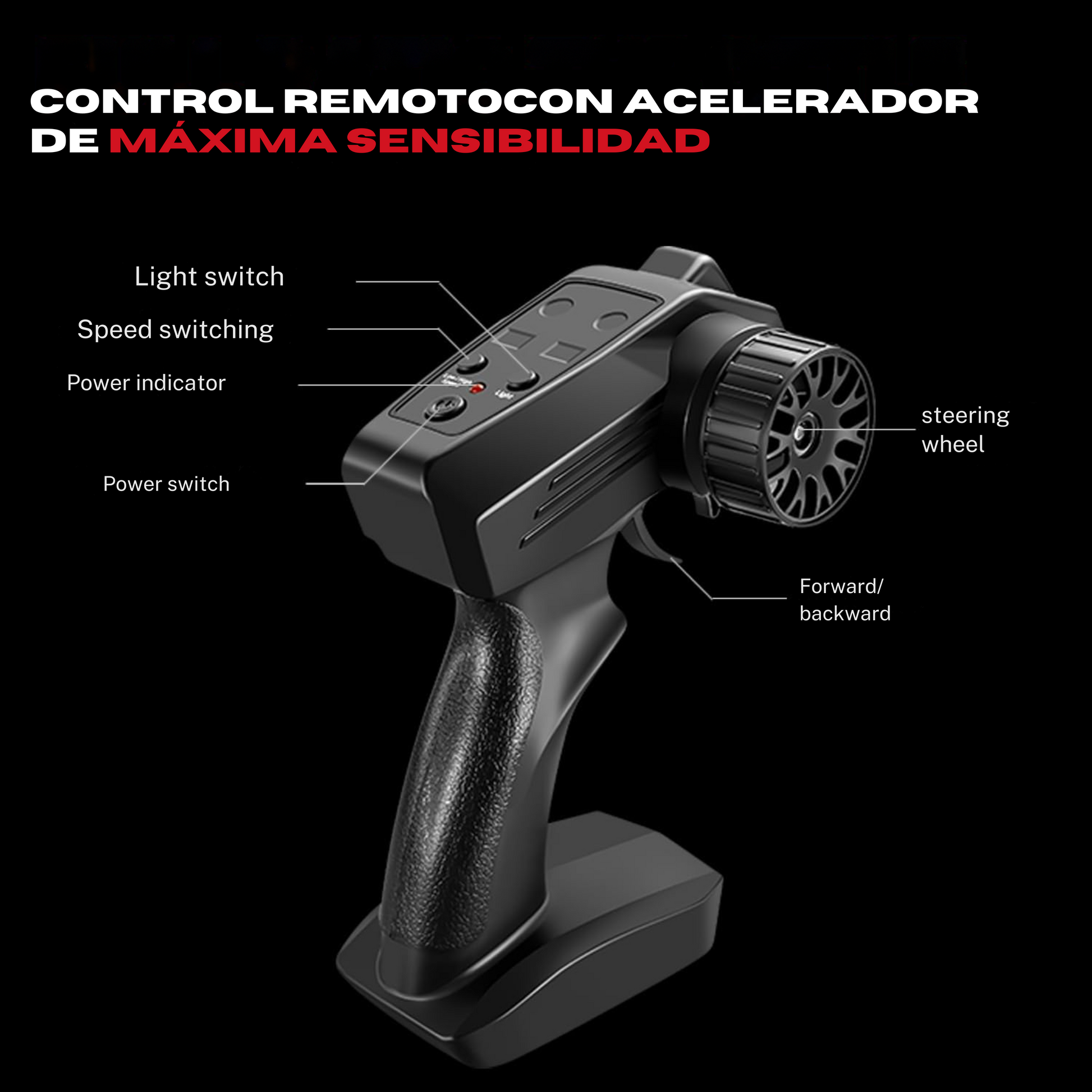 Su control remoto de alta sensibilidad te da un manejo preciso. Cambia la velocidad, enciende o apaga las luces, y domina cada curva gracias a su rueda de dirección y acelerador responsive. ¡Siente la potencia en cada giro!